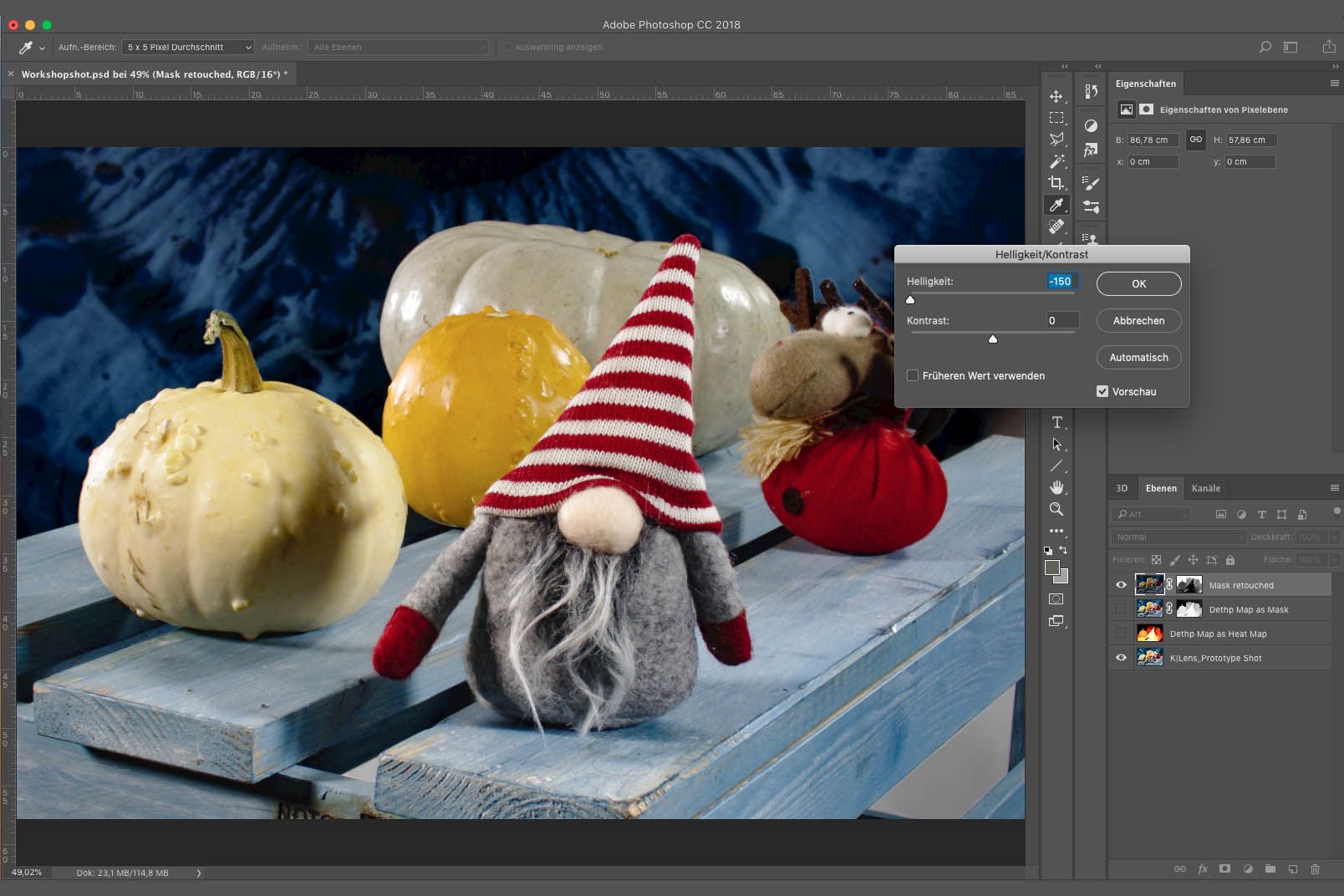Bei K|Lens-Fotos wird während des Ladens eines Bildes in der Nachbearbeitungssoftware Photoshop eine Tiefenkarte errechnet. D.h., die Farbinformationen in jedem Pixel werden mit Tiefeninformationen erweitert. In der Nachbearbeitung steht dir das Farbbild zur Verfügung, aber auch eine auf das Farbbild gemappte Tiefenkarte der Szene. Dies bietet völlig neue Möglichkeiten in der Nachbearbeitung!